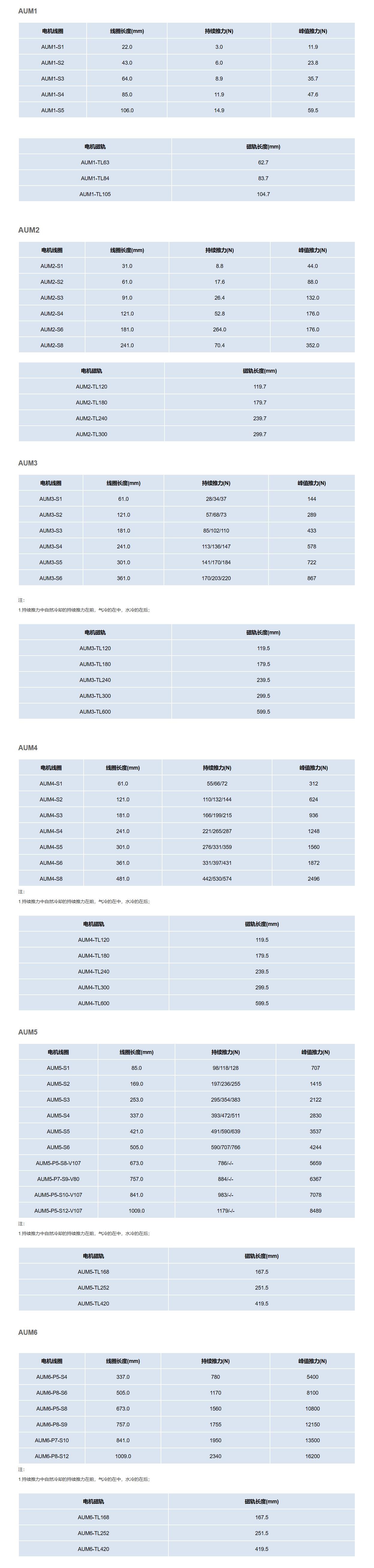 - 無刷無鐵芯電機AUM系列直線電機使用無鐵芯技術,使電機在較小體積獲得較高的推力,具有力密度較高的優勢。